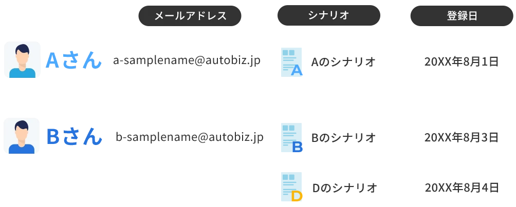 | リスト管理 | 登録者データの検索や、任意のステップ・メール配信開始日時を指定して新規登録、登録者データや配信スケジュールの個別変更が行えます。 |